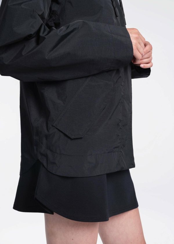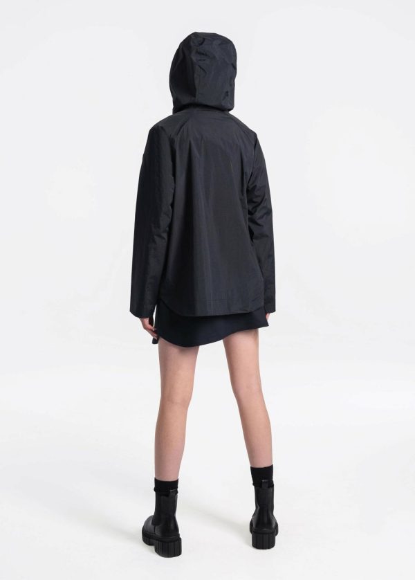 -fitting rain jacket is made with waterproof, breathable fabric, with a center two