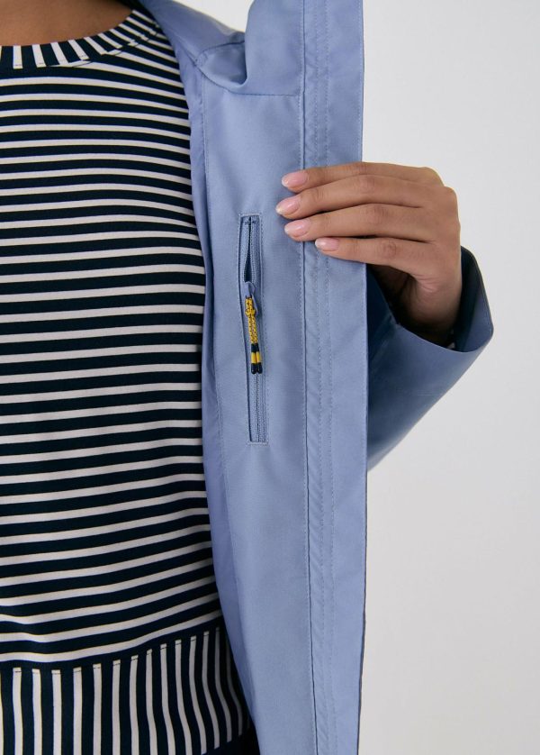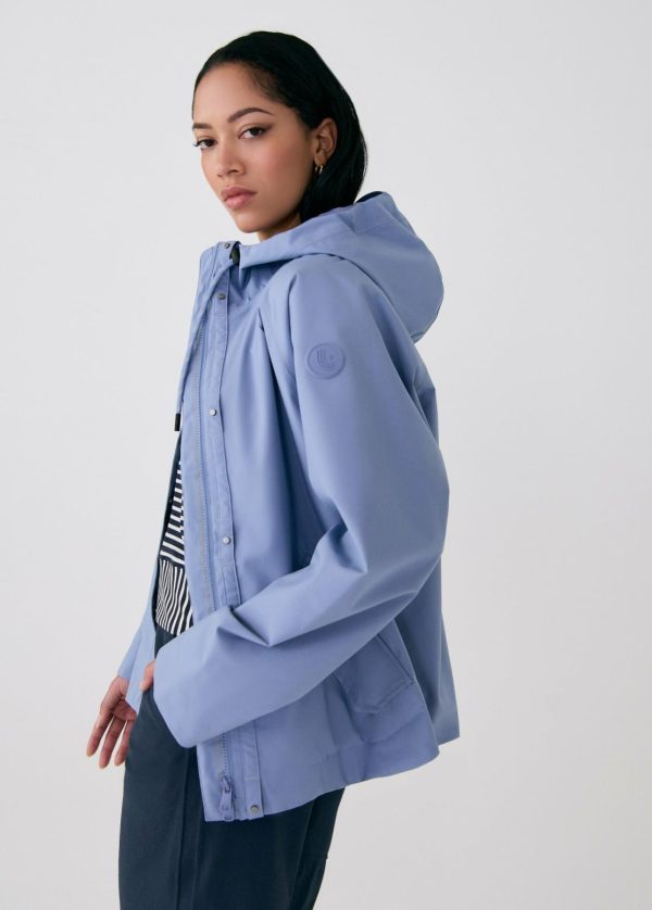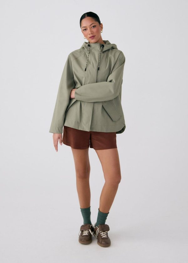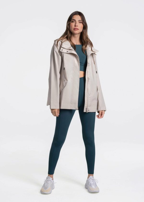 -fitting rain jacket is made with waterproof, breathable fabric, with a center two